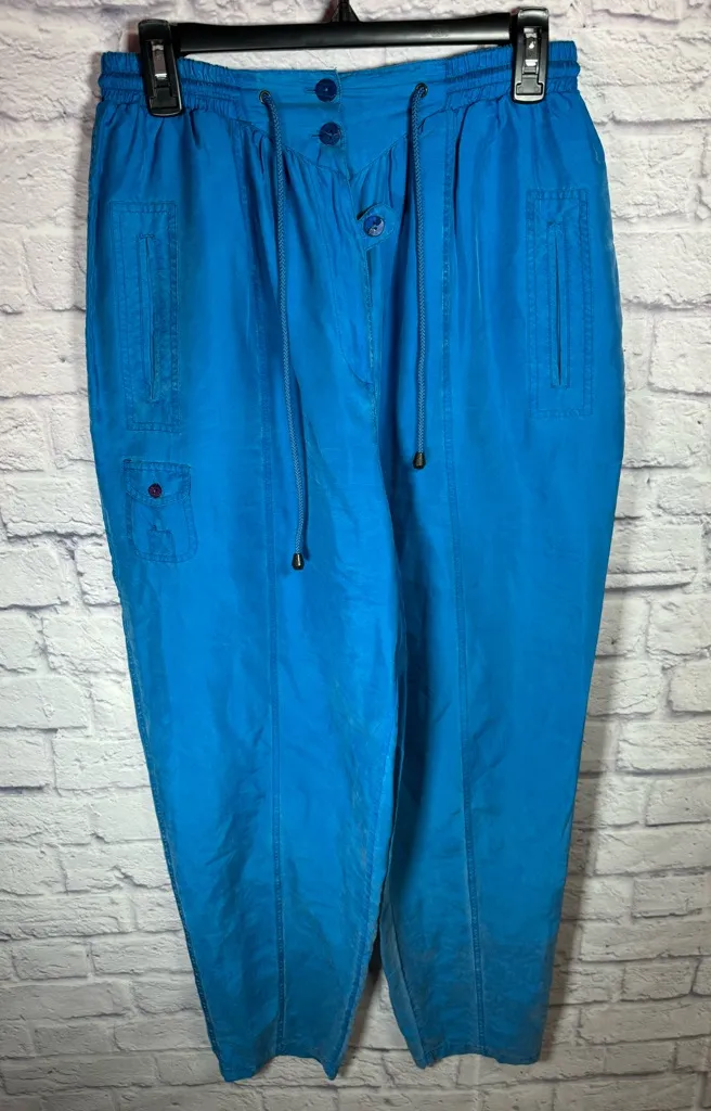 N SANDWASH SILK by BIANCA Vintage Pants high waisted baggy women’s size small blue color These do have some staining- a few dark stains on the leg area & the back of the heals show wear- all shown in images. Measurements are approximate 42” length 31” inseam Lightweight, colorful, old school, parachute pants, side leg, hi rise