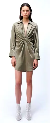 New with tags. Size Small. Sold out online. Perfect holiday vibes, or causal night out. The Roma Mini Dress in Willow. A sensuous recontextualizing of the shirtdress. Lush folds of high-sheen satin radiate from circular hardware detail. Mini-length silhouette cut for slight relaxed fit with deep-v neckline. 89% acetate, 11% polyester Made in China Dry clean only Unlined Pull-on styling O-ring detail at front Ruched satin fabric with hi-low hem Tags: dress, gown, slip, designer, revolve, fashion, event, cocktail, party, formal, pastel, wedding, guest, bridesmaid, satin, silky, sexy, holiday, xmas, christmas, new years, nye
