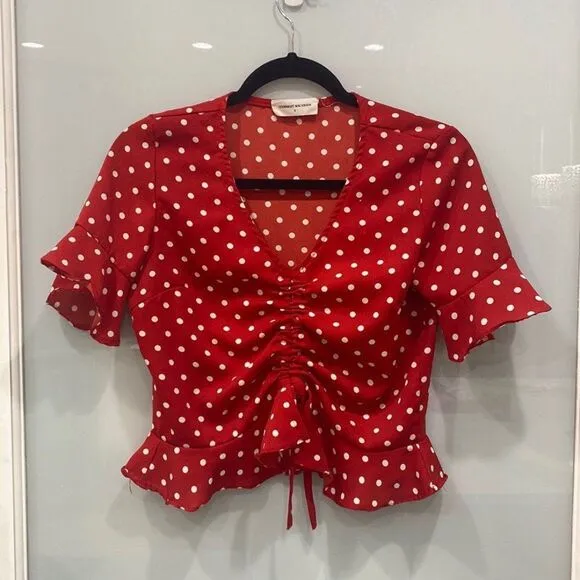 Goodnight Macaroon Women's Short Sleeve Red White Polka Dot Blouse Tie Ruffle S - $25 (59% Off Retail) - From Sasha