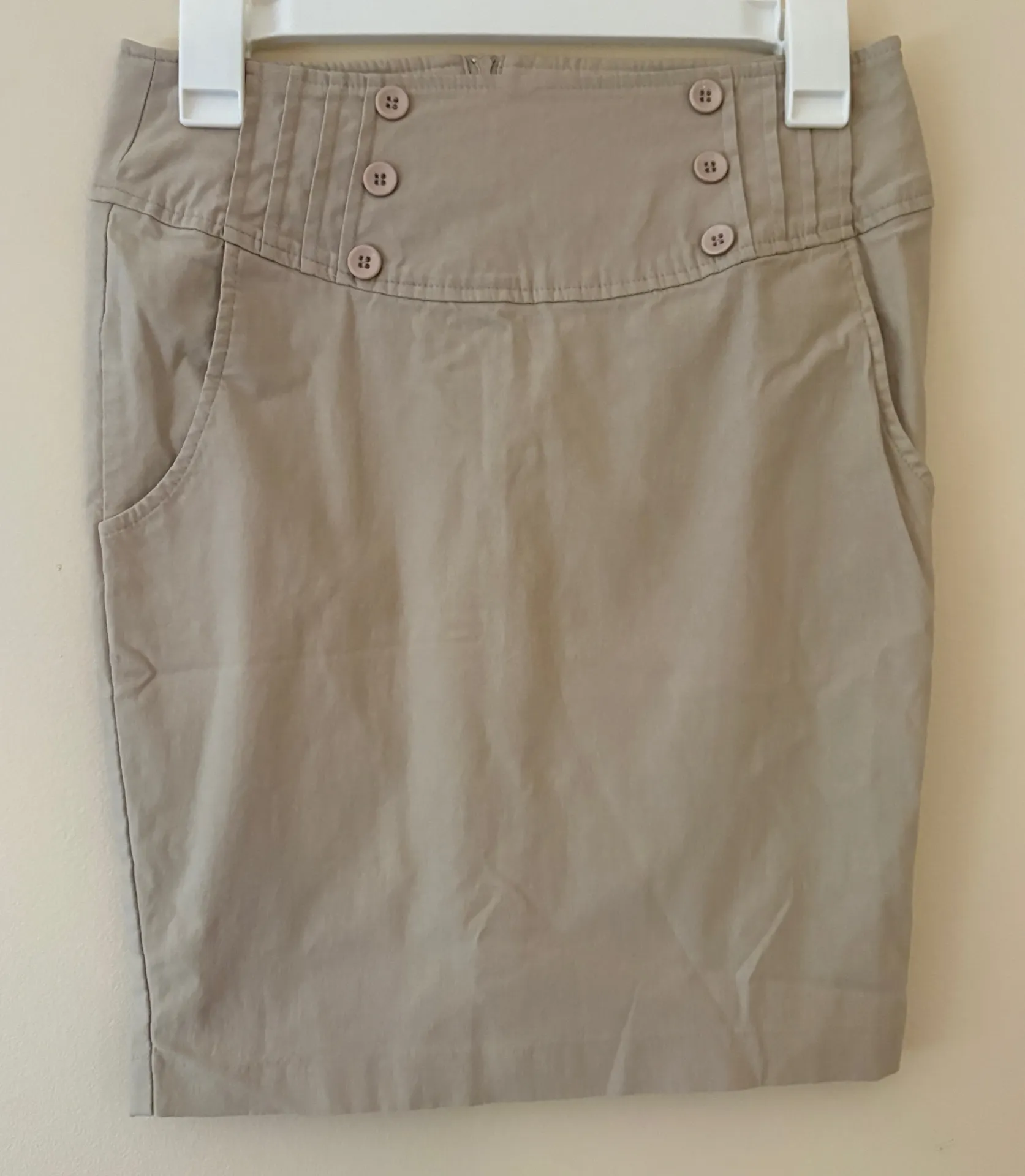 Neutral khaki pencil skirt with a nautical-inspired sailor button waist and front pockets. Mid-rise, straight silhouette with a comfortable cotton-nylon stretch blend. Back welt pockets and zip closure. Easy career-casual piece that pairs with tees, blouses, or knits. Details: • Brand: HAZE • Size: Medium • Color: Khaki / Beige • Style: Sailor button pencil skirt, mid-rise • Fabric: 74% Cotton, 22% Nylon, 4% Spandex • Front pockets; back welt pockets • Back zip; back vent Estimated Flat Measurements: • Waist: ~15” • Hips: ~19” • Length: ~20.5”