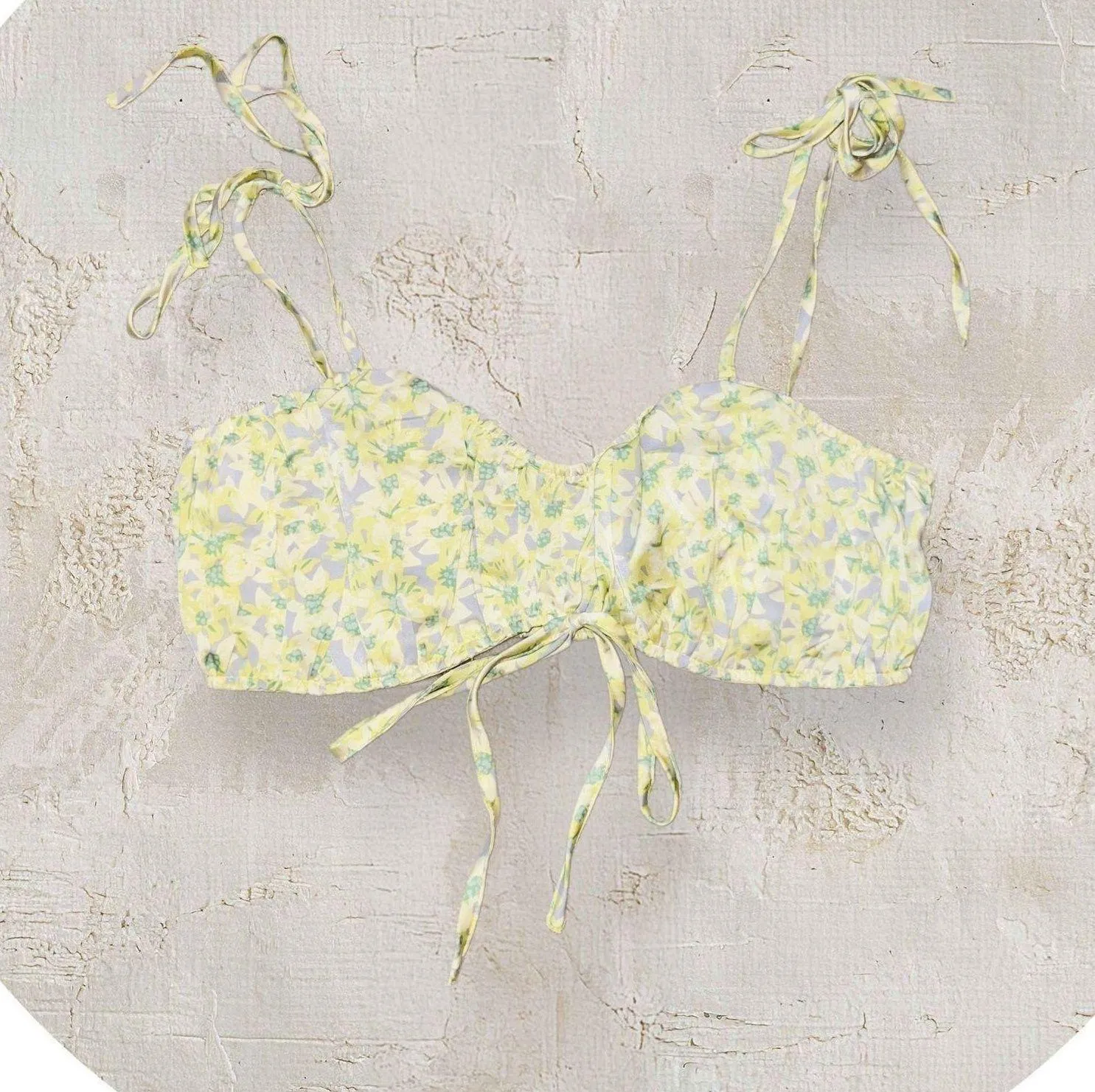 Yellow floral crop top with tie straps and front tie detail. Super lightweight and adjustable fit. g... Show more