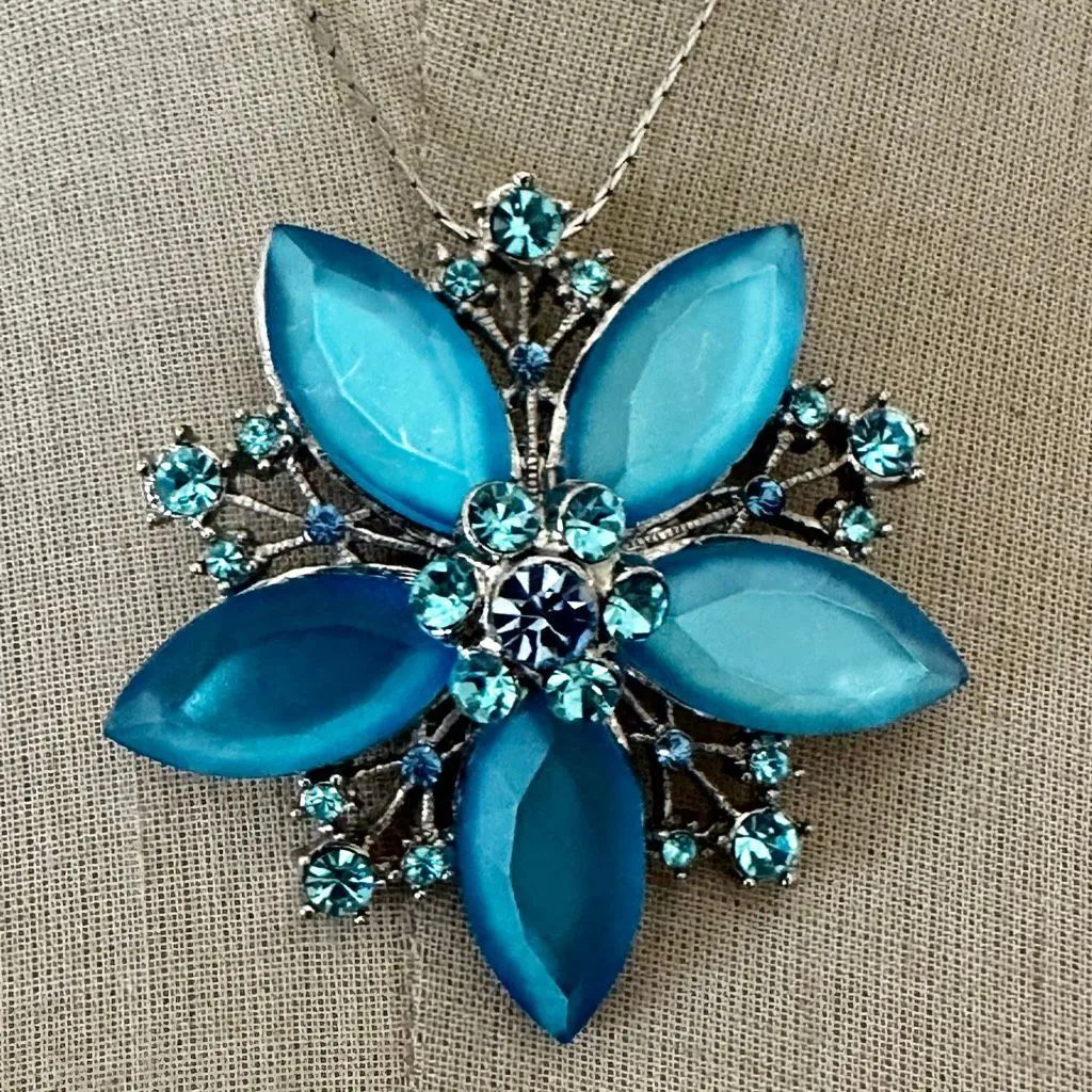 Stunning vintage statement piece featuring frosted navette cabochons in shades of aqua blue, accented by sparkling faceted rhinestones. The layered flower design is set in silver tone metal with a dual bail and pin back, making it wearable as both a brooch and a pendant. Versatile, eye-catching, and full of retro charm! ✨ Styling tip: Wear it on a chain for a bold pendant look or pin it on a jacket, scarf, or hat for instant vintage glam. Photos are part of the description. Reasonable offers welcome! #VintageJewelry #RhinestoneBrooch #BlueFlower #StatementPendant #RetroStyle #CostumeJewelry #Sparkle