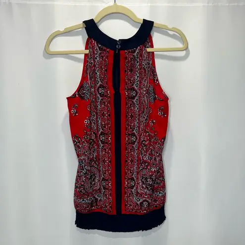 . Size small. Red and navy blue paisley print. Has an elastic hem and ties at the bottom hem for a cute detail. Has a keyhole detail at the back of the neck. 100% polyester. Excellent preowned condition. Refer to pics for measurements.