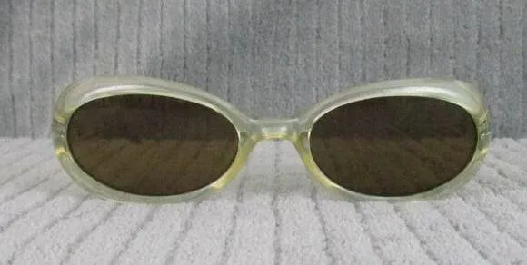 Divine Eyewear Athena sunglasses with pearl white clear composite frame and amber composite lens. High quality composite frames and lenses, integrated precision optical hinges and 100% UVA/UVB protection. AT-2714 Approx. Measurements: 50mm lens width, 5 1/8" wide frame, 5" long arms, 1 3/8" frame height.