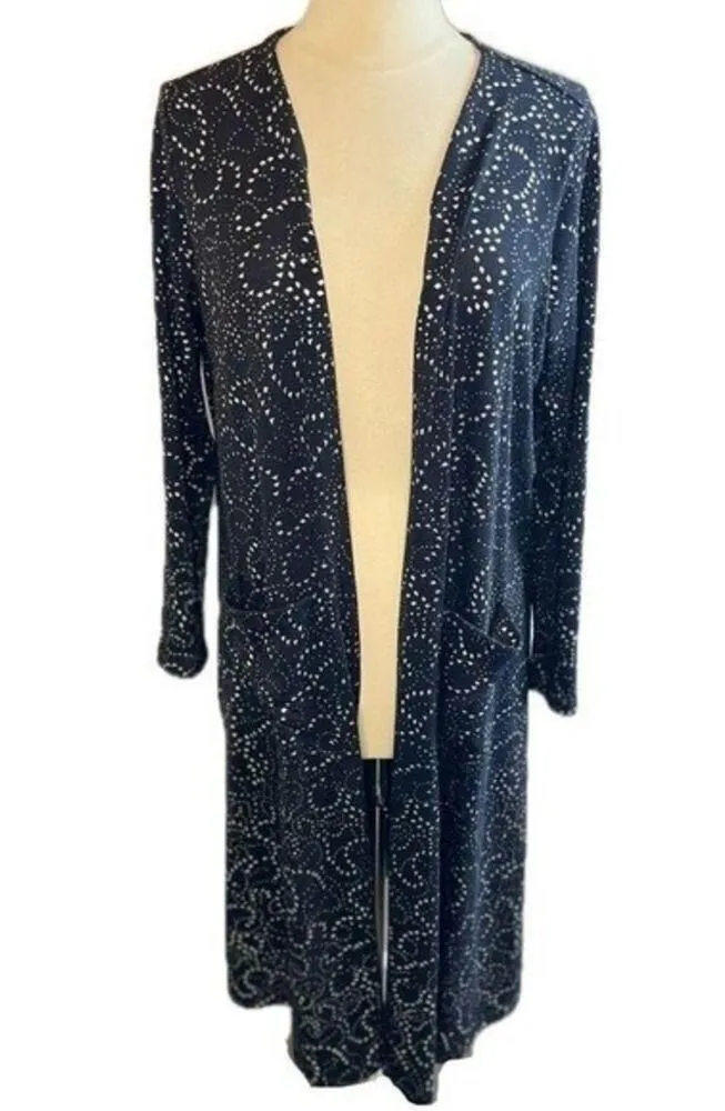 NWOT LULA ROE ELEGANT SARAH LONGLINE DUSTER CARDIGAN BLACK WITH METALLIC SILVER MICRO GEOMETRIC PRIN... Show more
