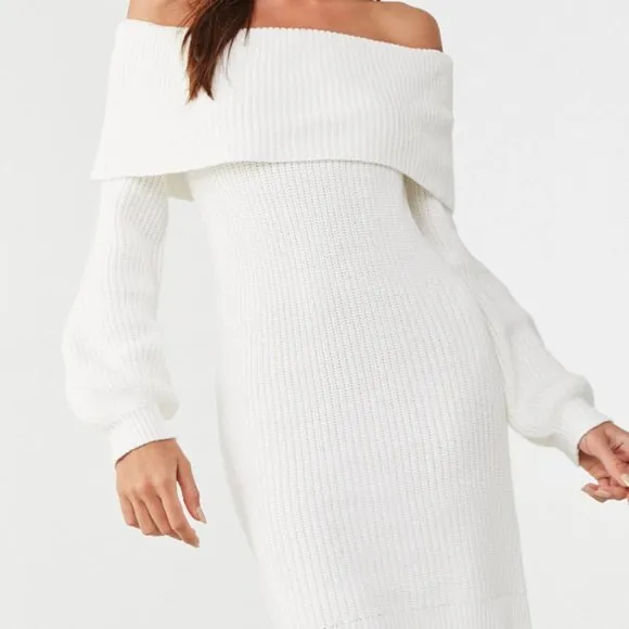 An ivory ribbed knit mini sweater dress featuring a foldover off-the-shoulder neckline and long ball... Show more