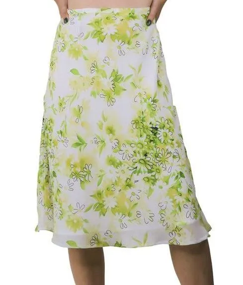 White knee length skirt with floral design. Sections of yellow and green daisy floral print, some fl... Show more