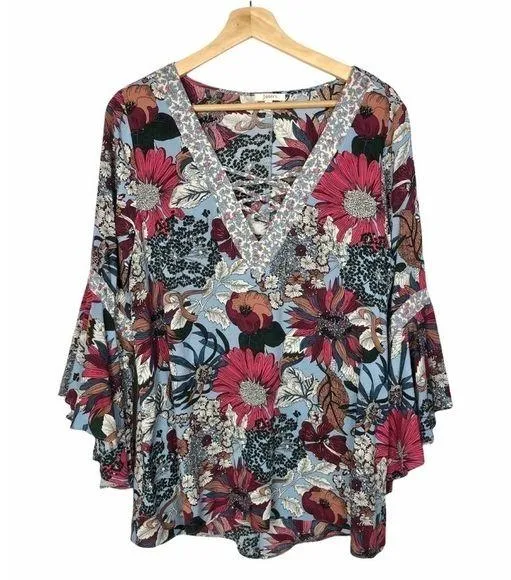 Jodifl Blue Floral Boho V-Neck Bell Sleeve Long Sleeve Top Excellent used condition, no visible sig... Show more