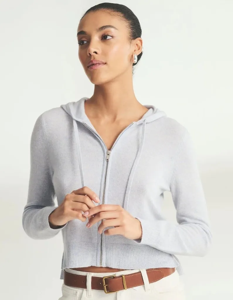Details: Condition: new with tags Size: Small Color: Pale Blue Heather Material: 100% Cashmere Fit: Classic – A versatile, timeless fit. For a tailored look, take your usual size. Size up for a more relaxed fit. Length: Short Classic – Designed to skim the top of the hip bones. Can be front tucked into high-rise bottoms. It features a drawstring hood, side slits, high-low hem, ribbed details, and full-zip construction. John 14:6