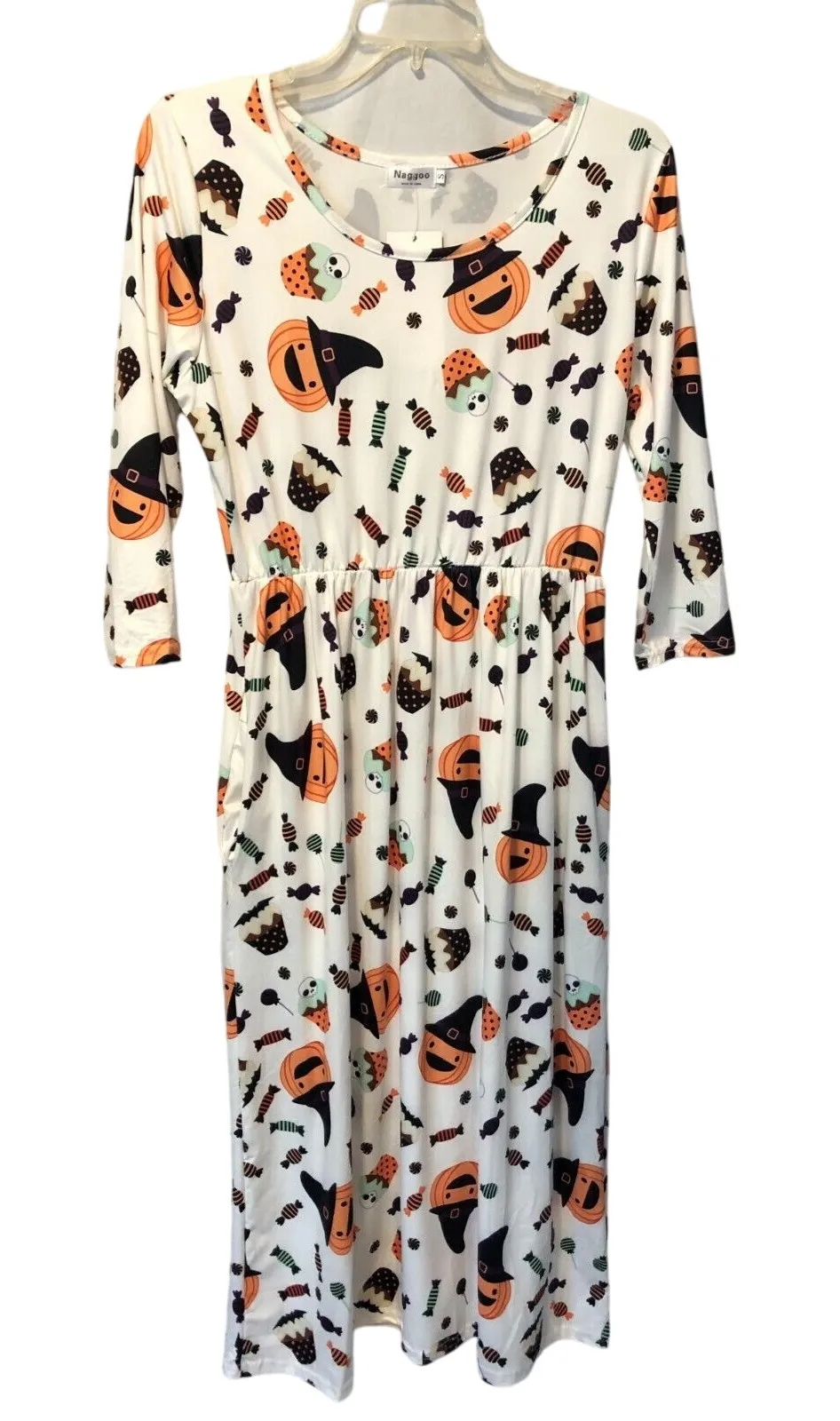 Naggoo Halloween Dress with hidden side pockets New With Tags Size small Pumpkins, bats, candy pullover fit and flair design with elastic waist +-19" armpit to armpit +-13" waist area un stretched +-23" hip area with more room +-44" long fun for party, event, candy handing out or candy collecting smoke free home