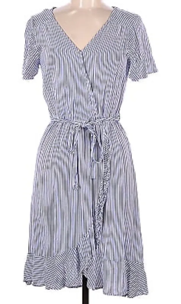 I’m selling a Naif Anthropologie Women’s Blue & White Striped Ruffle V-Neck Tie Waist Short Sleeve Wrap Dress Size Small for $40. - Excellent used condition - 100% polyester - Hand wash cold - Short sleeve midi length dress - Blue and white stripe pattern - V-neck - Beltloops with tie at waist - Elastic band at waist for fitted look - Ruffle hem that travels up to tie - Delicate and dainty that’s perfect for spring or summer