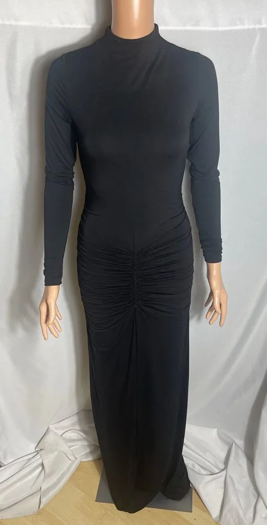 Sleek black bodycon maxi dress by Naked Wardrobe. Features a high mock neckline, long fitted sleeves, and flattering ruched detailing at the waist and hips. Soft, stretchy fabric with a smooth drape and back zip closure. Perfect for evening wear, date night, or a minimalist chic look. New with tag. Size: Women’s Small (tagged S) Measurements (approx): Chest (flat): ~14” Waist (flat): ~12” Hip (flat): ~15” Length (shoulder to hem): ~55” Material: 92% viscose rayon, 8% spandex Condition: New with tag Style Tags: minimalist, bodycon, evening, chic