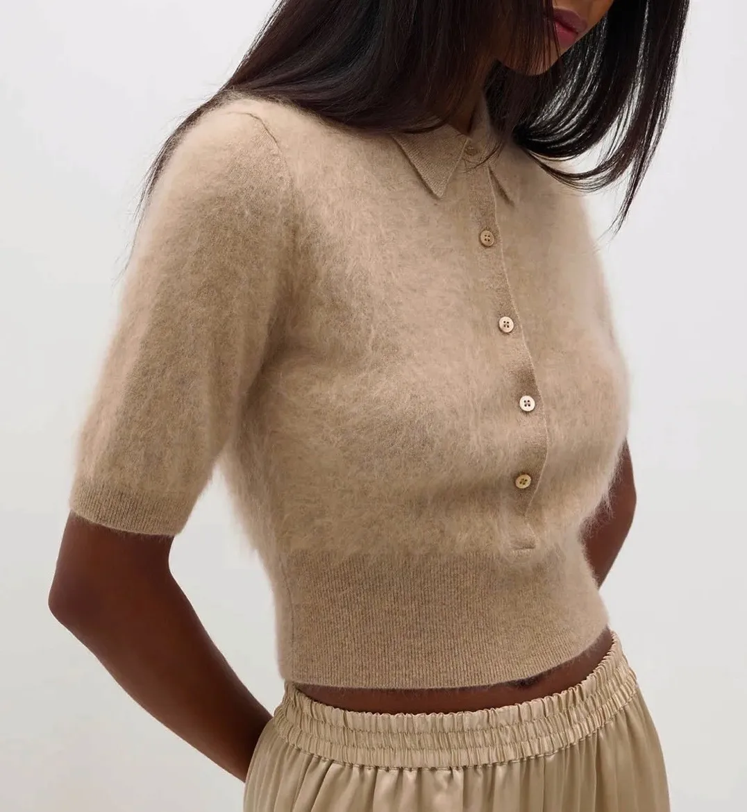 NakedCashmere Maisie Brushed Cashmere Collared Sweater Short Sleeve in Camel Tan. Good used condition with darker mark near front button. Please review all photos prior to purchase. Size XS/S. Chest - 17" Length - 18.5" This short sleeve crop style features a classic button-up front and a flattering ribbed hem. Perfect for layering or wearing on its own for a chic, comfortable look. Ideal for casual outings, a relaxed office environment, or weekend brunch. Style: Pullover Material: 100% Cashmere Fuzzy sweater, collared top, short sleeve sweater, cropped sweater, cashmere blend, neutral tones, minimalist, cozy knit, button front, soft texture, loungewear SKU 122925