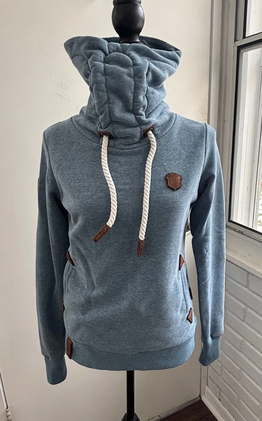 NAKETANO Darth Hoodie Sweatshirt in blue melange. Size small. Slight wash wear underneath some of the leather details as noted in photo otherwise excellent used condition Style: Pullover Department: Women Type: Hoodie Closure: Drawstring Theme: Owl, Animals, Logo Features: Hooded, Pockets Fabric Type: Knit Pattern: Solid Material: Fabric Accents: Logo, Button Sleeve Length: Long Sleeve Neckline: Cowl Neck Performance/Activity: Gym & Training, Yoga, Walking Season: Fall, Spring