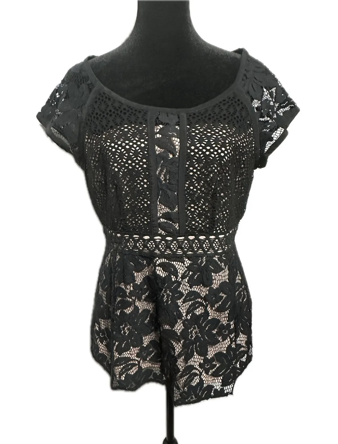 Keywords: Nanette Lepore, women's top, size 10, black, lace detailing, sheer sleeves, jewel neckline, waist trim, hidden zipper, cap sleeve, regular size, fashion, elegant, pre-owned.
