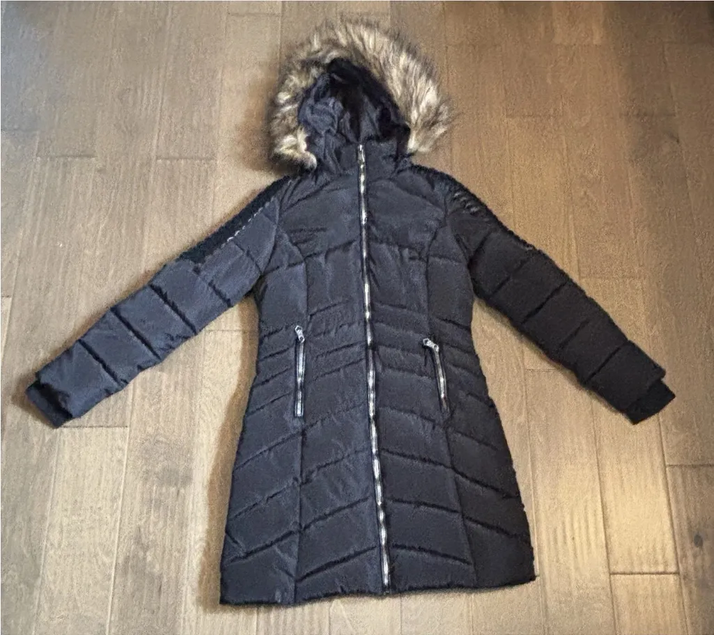 Stay warm and stylish with this black hooded puffer coat. Perfect for chilly days, it features a coz... Show more