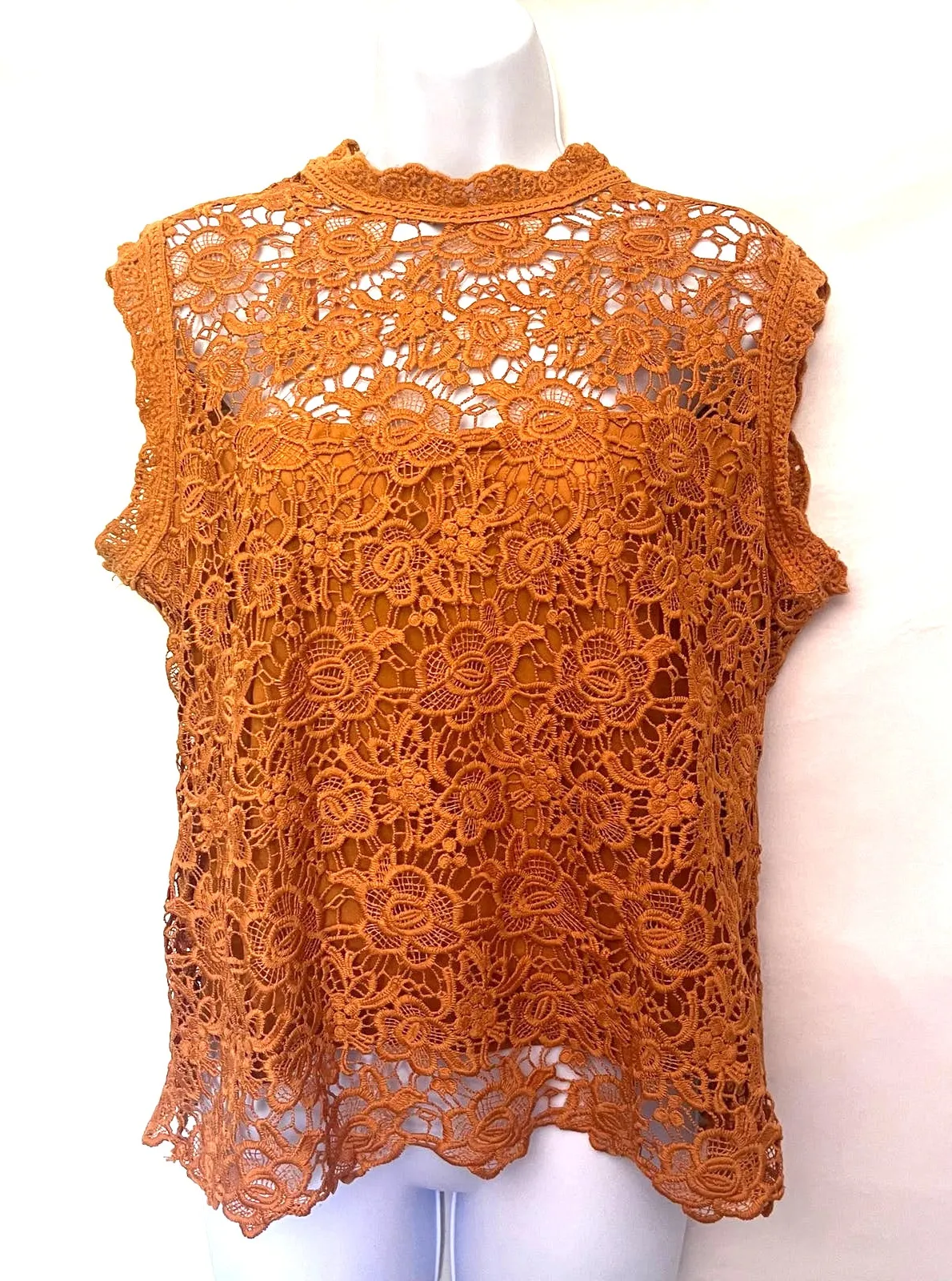 Mustard Gold Nanette Lepore Crochet Lace Sleeveless High Neck Lined Top