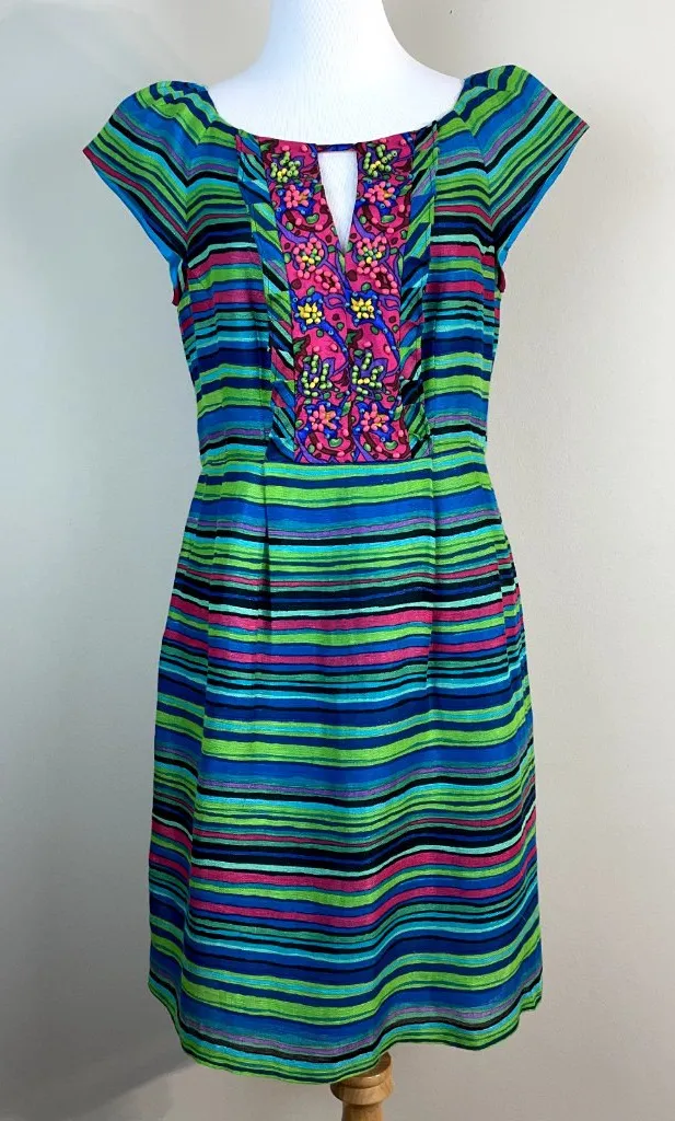 Nanette Lepore Dress 8 Blue Green Silk Linen Stripe Beaded Ruffle Sheath Mamacita Frock Very good c... Show more