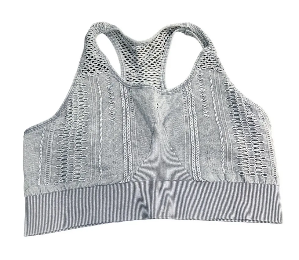 Keywords: Nanette Lepore, sports bra, athleisure, racerback, crochet, cutout, activewear, yoga, gym, workout, fitness, support, comfort, gray, plus size