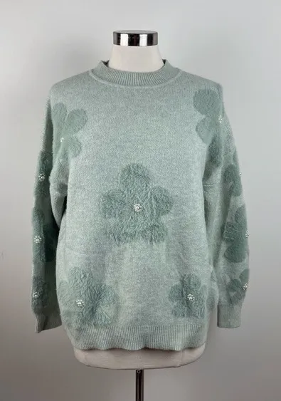 Nanette Lepore Green Floral Fuzzy Pearl Sweater Designer Women size medium Preppy Polyester, nylon,... Show more