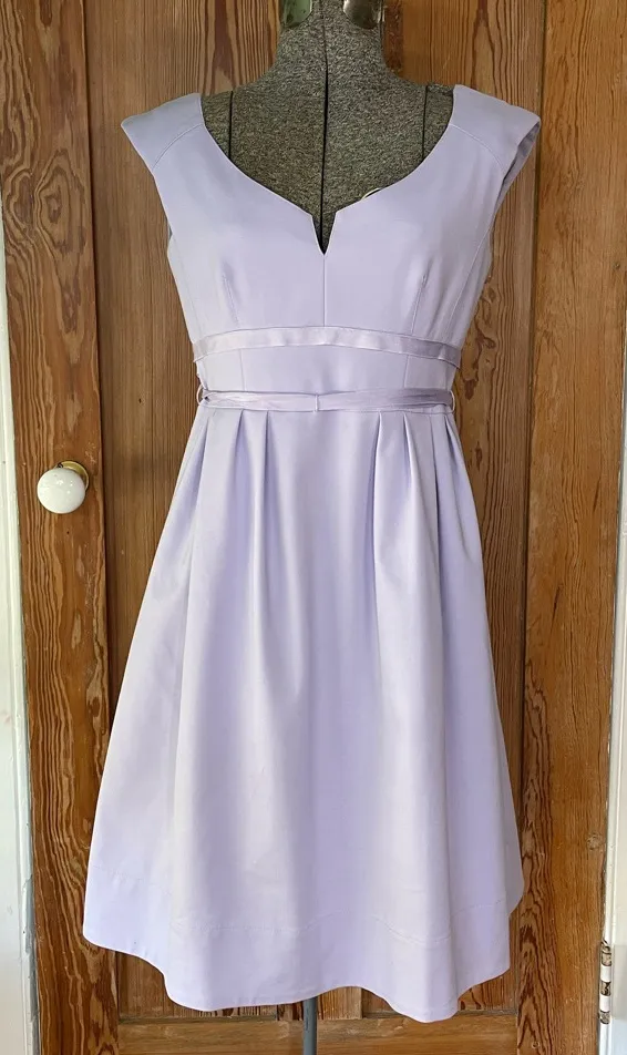 princes, fairy core, ballet core, dollette, ethereal, whimsical, romantic, feminine, ribbon waistband, fit & flare, lavender dress, pastel purple, spring dress, summer dress, garden party, bridesmaid style, cocktail dress, occasionwear, classic, Nanette Lepore,