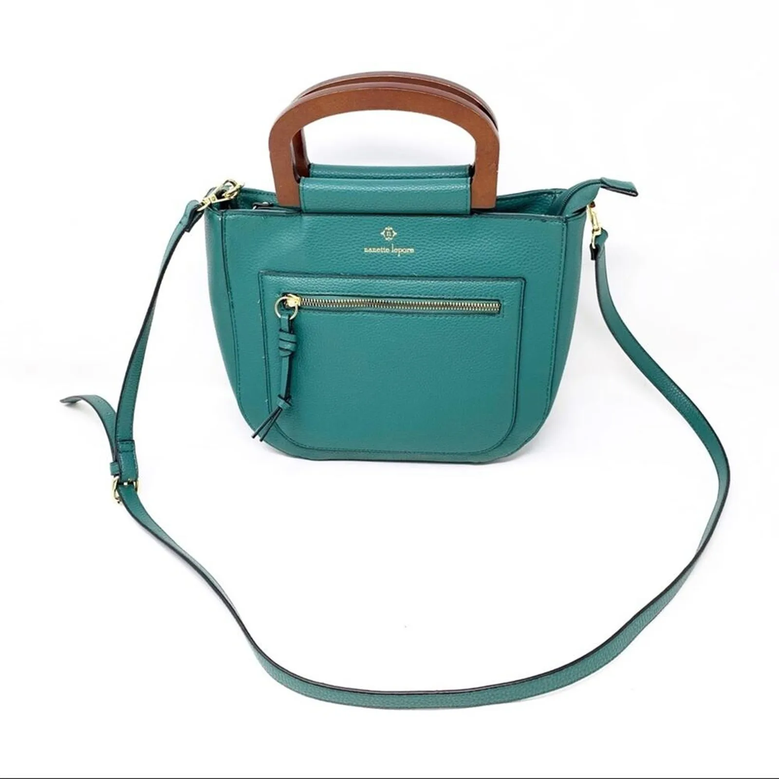 Nanette Lepore Teal Green vegan Leather Wood Handle Satchel Crossbody bag. Detachable crossbody stra... Show more