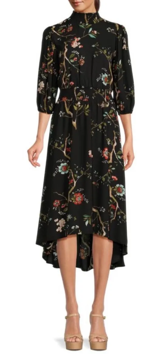 Cinched with a smocked waist, this midi dress flaunts an allover floral print in a high-low silhouette. Highneck Three-quarter sleeves, puff Elasticized cuffs Pullover Smocked waist High-low hem Polyester Machine wash Imported Measures 18” across chest pit to pit 50.5” length from shoulder to hem