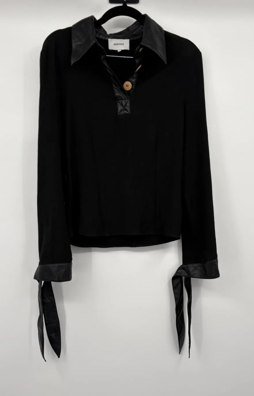 Elevate your wardrobe with this sophisticated Nanushka shirt, a masterful blend of classic tailoring and modern edge. The rich black fabric drapes beautifully, complemented by a striking faux leather collar and cuffs that add a touch of luxurious texture. The unique tie details on the sleeves offer a playful yet chic accent, allowing you to customize your look. Finished with elegant wooden button details, this piece is perfect for making a statement during a chic dinner out or a sophisticated brunch. Measurements: • Length: 25 in • Sleeve Length: 24 in Type: Blouse Department: Women Style: Basic Material: Triacetate, Polyester, Polyurethane Neckline: Collared Sleeve Length: Long Sleeve Sleeve Type: Classic/Fitted Sleeve Pattern: Solid Accents: Button, Strap Features: Stretch Fit: Classic Fabric Type: Woven Occasion: Casual, Party/Cocktail, Workwear Closure: Button Keywords: Nanushka shirt, faux leather, designer blouse, chic, elegant, statement sleeve, button detail, sophisticated, evening wear, day to night, contemporary, minimalist