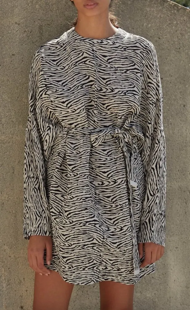 . A feminine style with simple and soft-spoken details, the Hierro dress gives off a casual feeling. The crew-neck style and built-in tie waist belt allow the zebra block 60s pleat to sit softly on your skin while still giving you room to breathe, making it the perfect informally beautiful piece. - 60'S PLEAT: Body: 99,5% Viscose 0,5% Elastane - Detail: 65% Polyester 35% Polyurethane please note - dress does not come with its original belt. The dress does have tonal belt loops that match the pattern, so you can easily add a chic black belt of your own to complete the look or wear without!