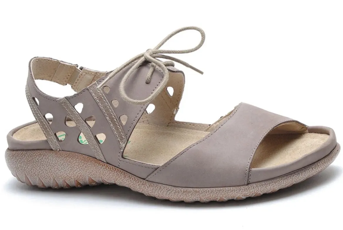 I'm not sure why the footbeds are different colors. Naot women's sandals in a taupe hue featuring a comfortable flat orthotic sole and adjustable lace-up front. The design includes cutout details on the straps and a slingback heel with buckle closure for a secure fit. The brand's signature contoured footbed provides excellent arch support and cushioning. The durable outsole is designed for stability and traction. Keywords: Naot footwear, orthotic sandals, comfortable shoes, women's comfort, lace up sandals, slingback sandals, leather sandals, supportive shoes, travel shoes, everyday wear, summer sandals, European comfort, podiatrist recommended