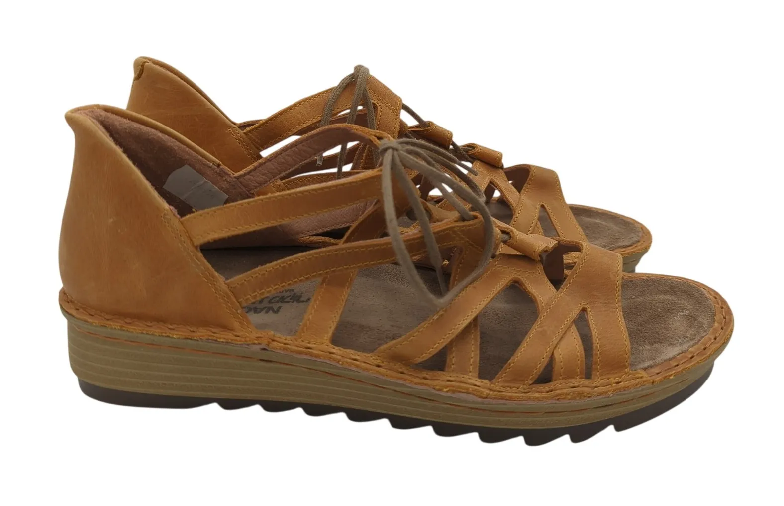Style: Strappy Department: Women Upper Material: Leather UK Shoe Size: 7.5 AU Shoe Size: 7.5 Heel Style: Wedge EU Shoe Size: 41 Features: Cushioned, Comfort, Arch Support, Breathable, Adjustable Closure: Tie Pattern: Solid Heel Height: Mid (2-2.9 in) Type: Sandal Product Line: Naot Insole Material: Leather Keywords: tan sandals, leather sandals, lace up sandals, gladiator sandals, wedge heels, comfort shoes, artisanal, European size 40, summer footwear, casual sandals, bohemian sandals, strappy sandals Please see photos for signs of wear, if any.