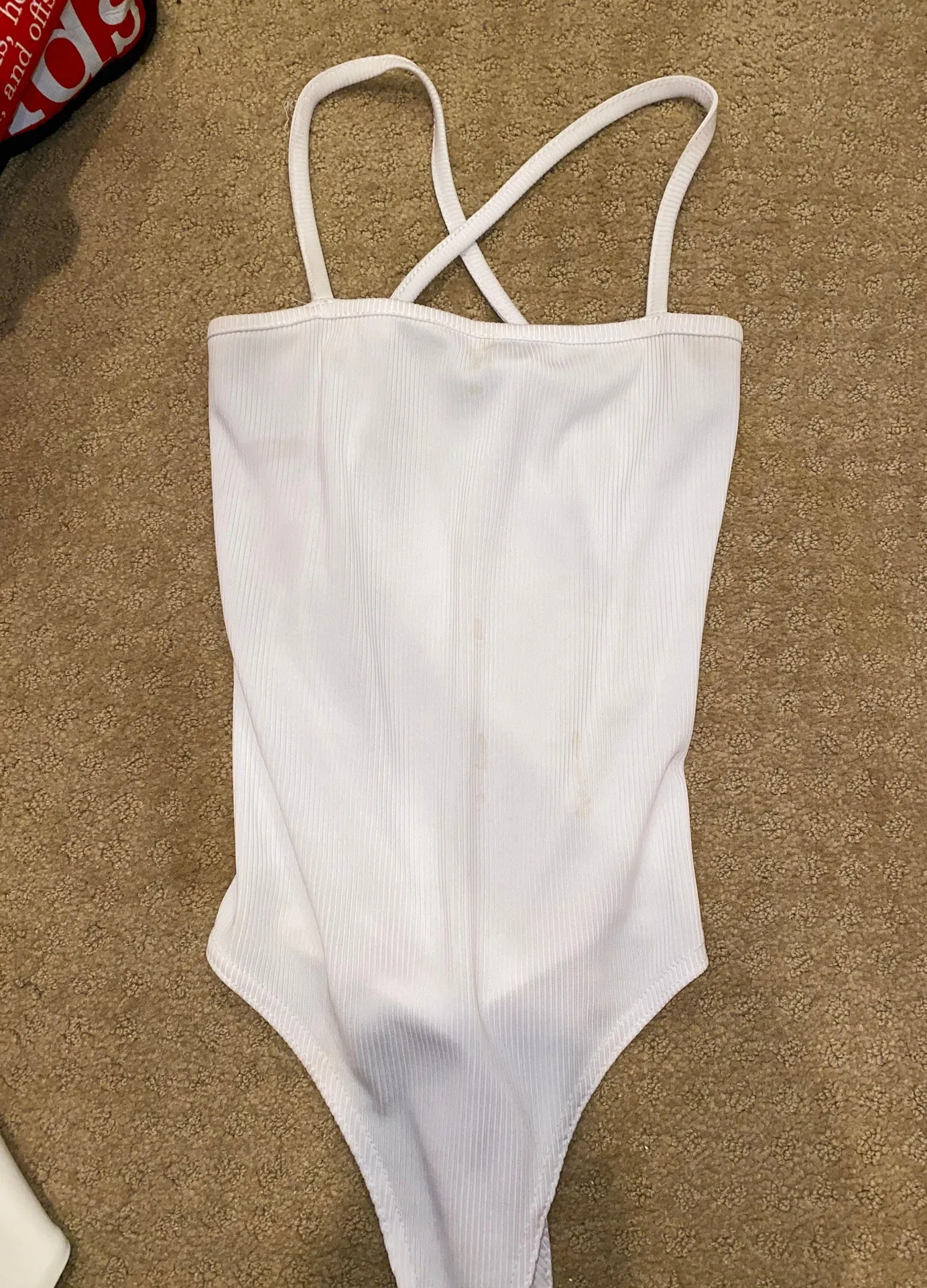 White square neck nasty gal bodysuit; has small brown stain