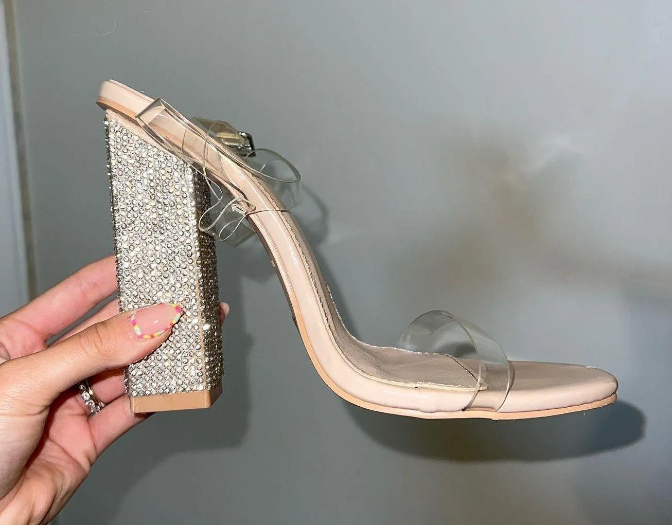 Clear straps, sequin sparkly heel, worn once!