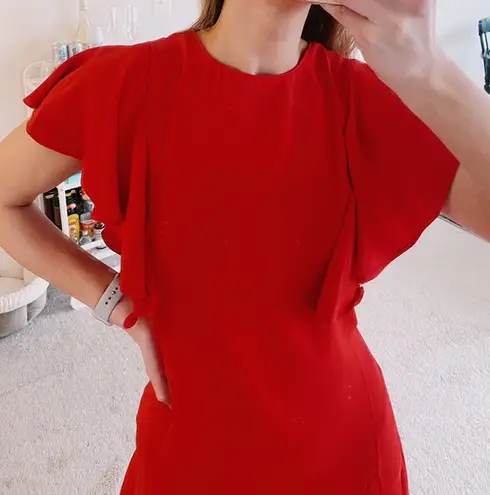 High neck red shift dress with flutter sleeves at shoulder. Size S, fits a 2/4. I’m a 34B and it fit... Show more