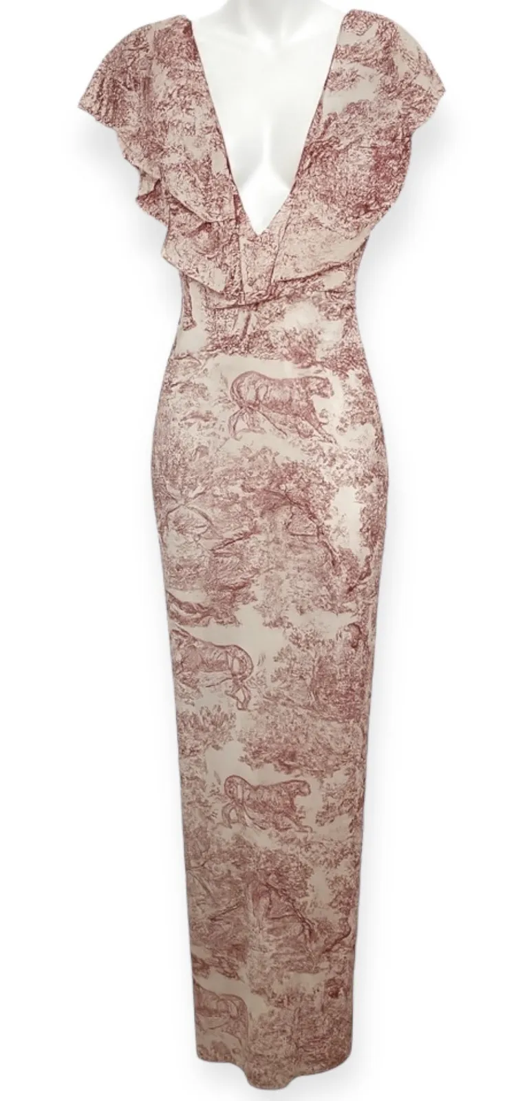 Romantic + statement maxi dress featuring a vintage toile pastoral print with a big cat/panther and... Show more