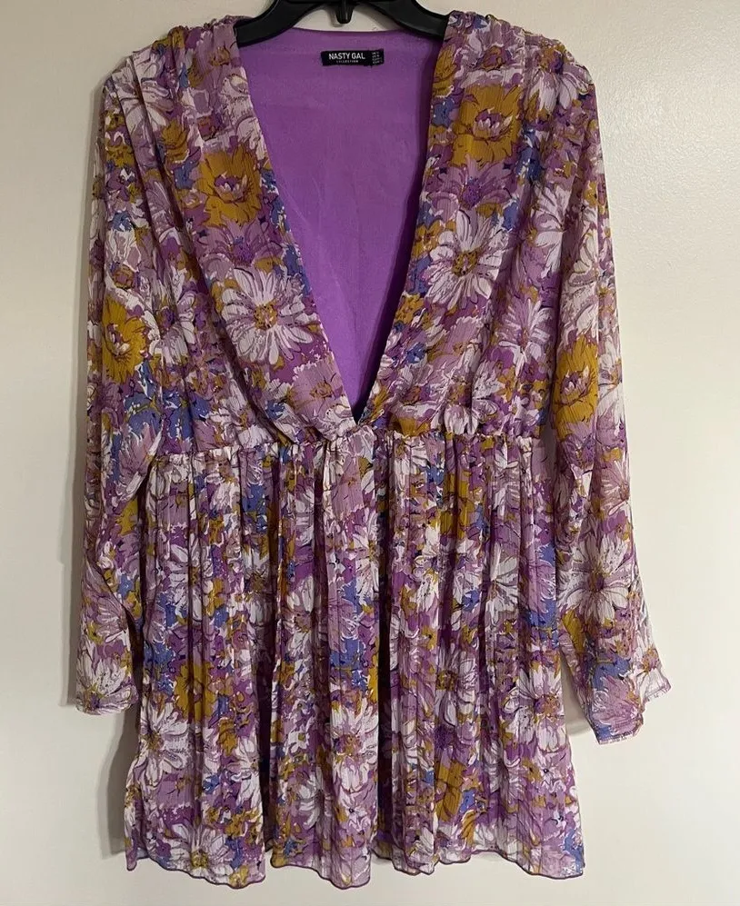 Women’s Nasty Gal Sunflower Lilac Floral Print Pleated Plunge Neck Line Mini Dress Size 10 Pit to pi... Show more