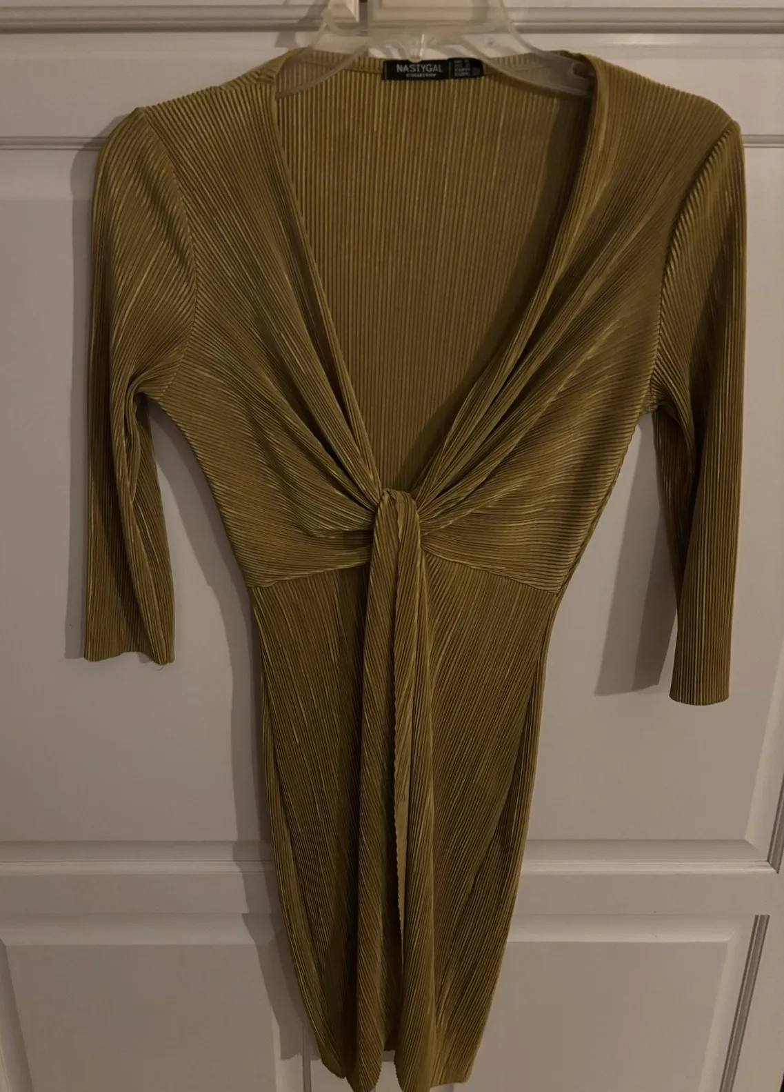 Command attention in this striking NASTYGAL COLLECTION midi dress. Its shimmering gold hue and intricate pleating create a captivating texture that catches the light with every movement. The flattering twist-front design cinches your waist, while the plunging neckline adds a touch of alluring sophistication. Perfect for an evening out, a special celebration, or a glamorous cocktail party. Length 34" pit to pit 17" Style: Bodycon, Wrap Dress Dress Length: Knee Length Department: Women Sleeve Length: 3/4 Sleeve Pattern: Solid Occasion: Party/Cocktail Material: Polyester Blend Fabric Type: Knit Theme: Bohemian Neckline: V-Neck Season: Spring, Fall Sleeve Type: 3/4 Sleeve Closure: Pullover Accents: Pleated, Bow Features: Ruched Keywords: NastyGal, midi dress, gold dress, pleated dress, twist front, long sleeve dress, evening dress, cocktail dress, party dress, glamorous, sophisticated, women's fashion