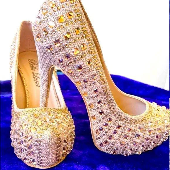 Walk in style with these rhinestone studded shimmering stiletto dress pumps, size 7.5, featuring a pointed toe, glitter mesh material, rhinestones, a cushioned insole, an approximate 1 inch platform for extra comfort, and an approximate 4.75 inch high stiletto heel. Style fits true to size. By Bella Luna Shoes. New, in original box with Heel covers, never worn. Offers welcome