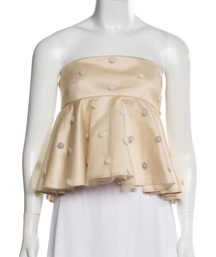 Natasha Zinko Crop Top Neutrals Embroidered Accent Strapless Concealed Zip Closure at Side Poofy Pe... Show more