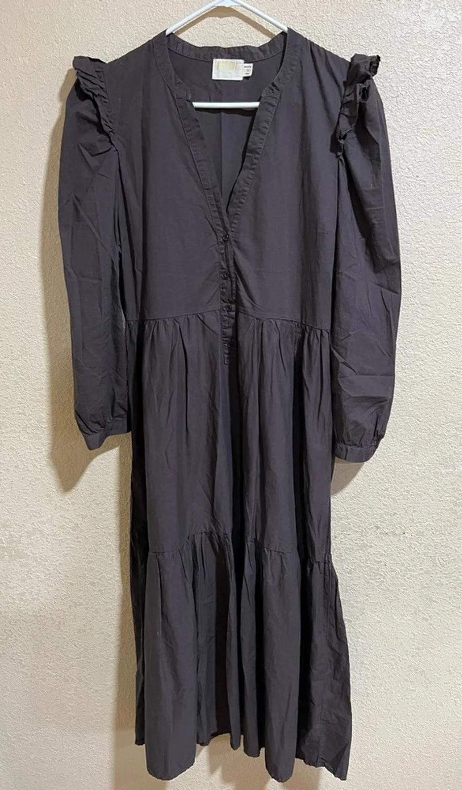 With its ruffled shoulder detail and flattering tiered bottom, this Victorian silhouette in Pima Cotton Poplin is ideal for looking sexy and chic. Easy fit, A-line Stonewashed Cotton Poplin/ 100% Pima Cotton Ruffle shoulder long sleeves Machine wash Made in Peru SUSTAINABILITY SCORE: A WHAT WE LOVE: A low carbon footprint. Our Stonewashed Cotton Poplin goes from seed to garment all in Peru, minimizing supply chain pollution from transportation. Additionally, Pima Cotton is native to Peru and uses 50% less water than traditional cotton. Great used condition