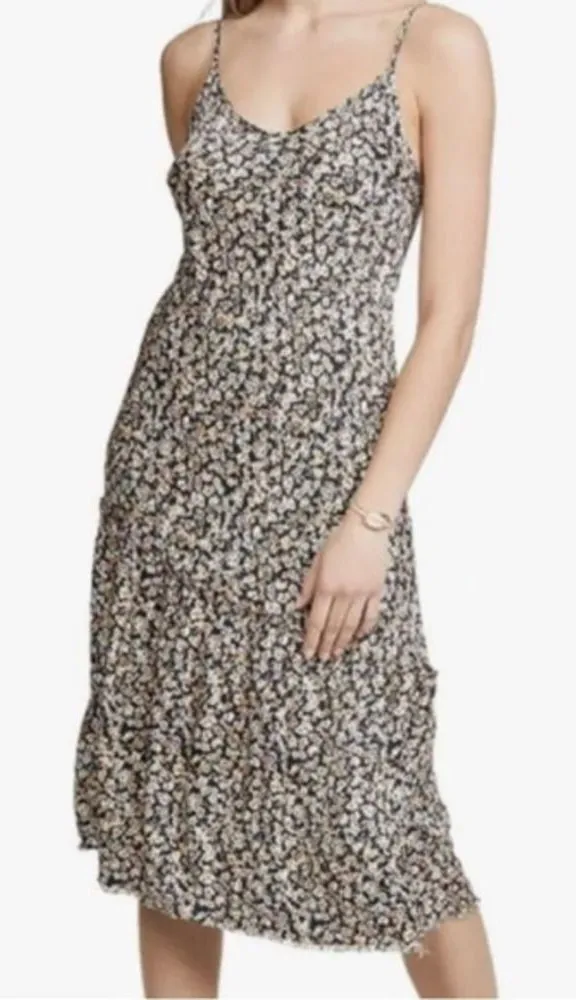 Our classic slip dress gets a playful asymmetric ruffle detail. Cut on the bias, it will naturally form to your body in the most flattering way. This one comes in a 90s inspired ditsy floral print and distressed hem. Adjustable straps. One strap is slightly twisted and is not noticeable and can possible be fixed. Approximate measurements: underarm to underarm 18”. Farrah Dress | Nation LTD. Nation Ltd Farrah Satin Slip MIDI Dress Floral Print, 100% Viscose, V-Neck, Sleeveless, sexy, feminine, elegant, romantic, 1920s, 1930s, 1940s, 1950s, 1960s, 1970s, vintage, retro, pin-up, boudoir, boho, bohemian, cottagecore, hippie, granola girl, flower child, flowy, soft, Victorian, feminine, girly, indie, hipster, gypsy, folk, shabby chic