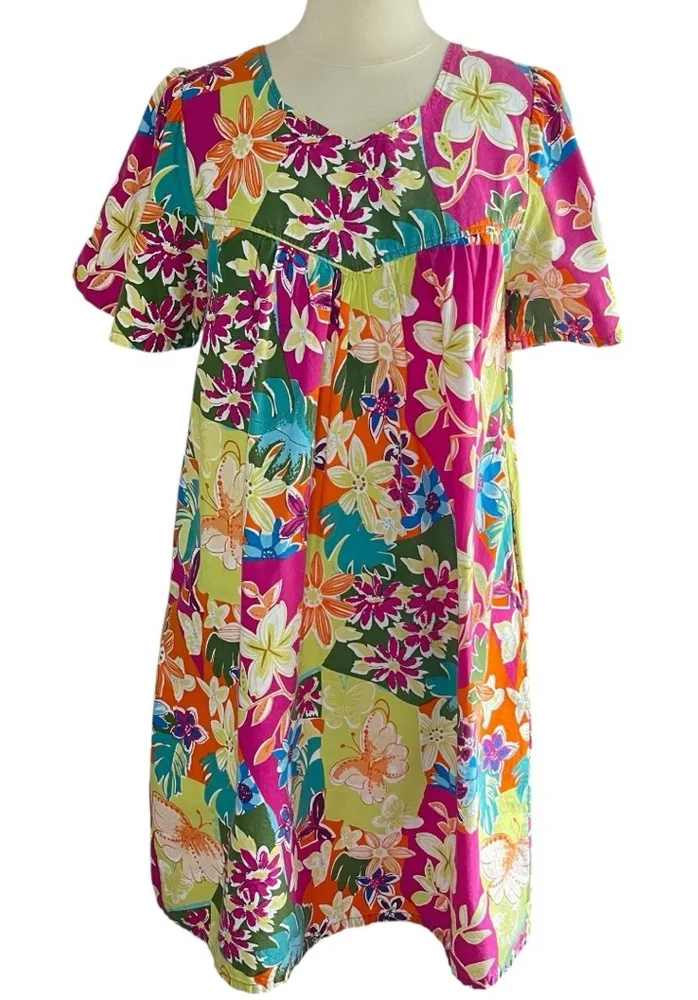 NATIONAL Tropical Floral Butterfly Print Cotton Patio House Dress Size: Medium P2P: 20” Length: 40” Tags missing, research found this to be 100% Cotton from the brand “National” (shopnational.com). Bright and colorful short-sleeve patio shift dress that features on-seam side pockets and a relaxed fit. Cotton poplin fabric has butterflies and tropical flower all-over print. Will fit up to a Medium and maintain relaxed fit. Pullover styling. PREOWNED, EXCELLENT CONDITION (No flaws) ALL SALES FINAL. WE SHIP SAME OR NEXT DAY. Please check measurements to ensure proper fit. Review disclaimer for condition expectations.