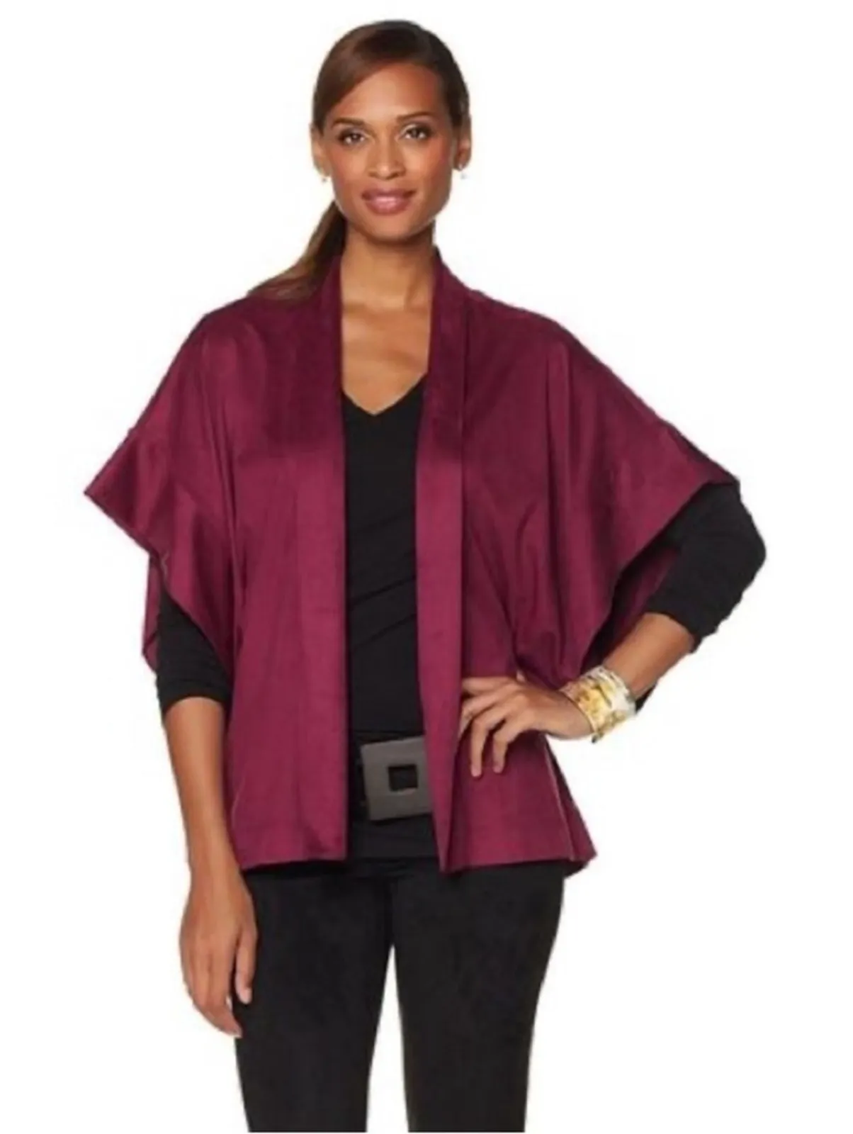 Natori Faux Suede Burgundy Cropped Kimono Half Sleeve Topper This statement piece seamlessly merges... Show more