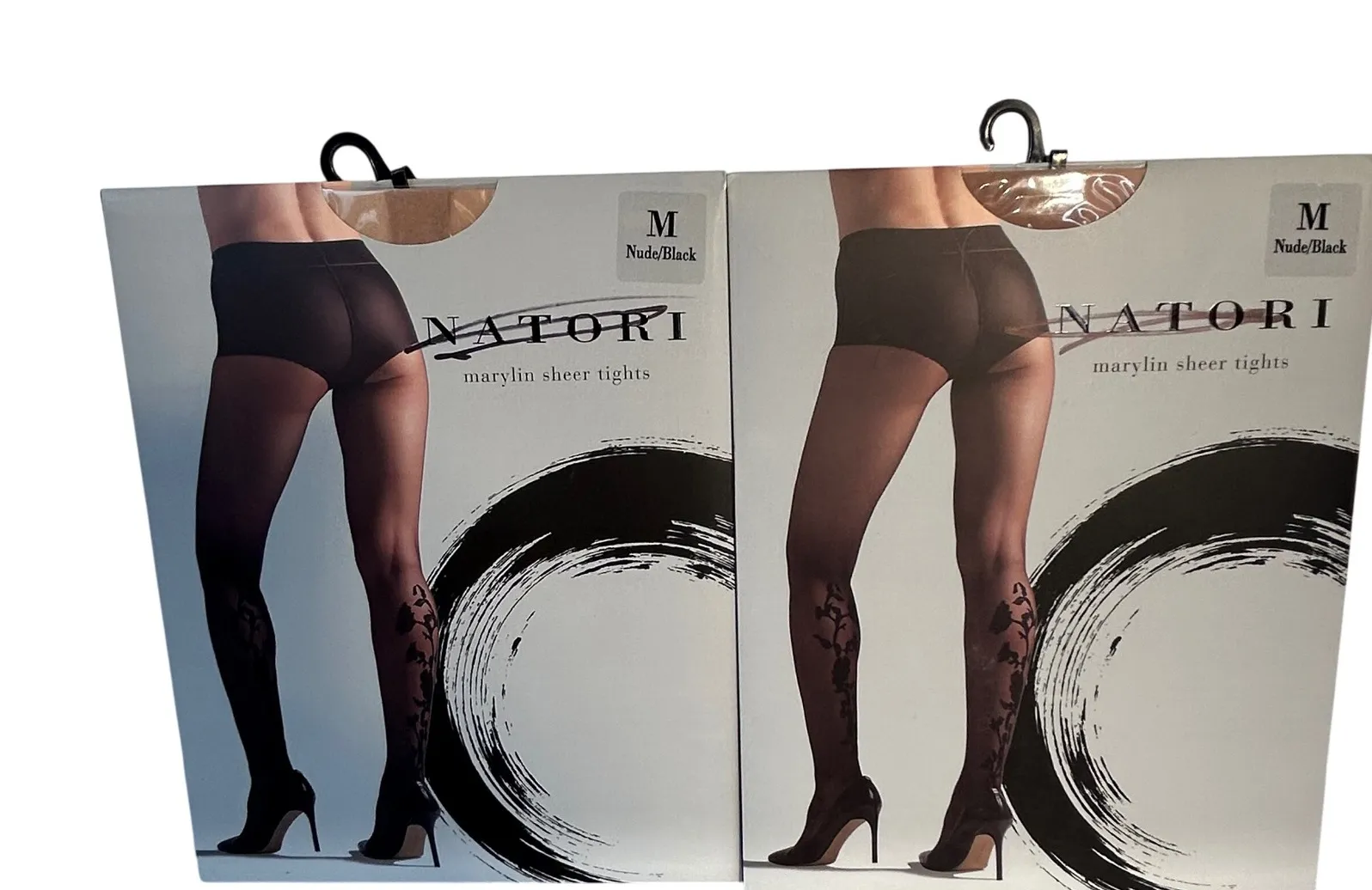 Natori Marylin sheer tights in a nude/black colorway. These medium size tights feature a delicate floral pattern on the leg. The packaging displays a model wearing the tights, highlighting their sheer appearance and the subtle embellishment. Pair of 2 Type: Tights Opacity: Sheer Material: Spandex, 100% Nylon Features: Breathable, High Waist Pattern: Floral Toe Style: Sheer Toe Denier: Less Than 10 denier Department: Women Occasion: Casual, Everyday, Glamour, Party/Cocktail Season: All Seasons Number in Pack: 2 Pairs Garment Care: Machine Washable Keywords: Natori tights, sheer hosiery, floral pattern, medium size, nude black, fashion tights, designer hosiery, leg wear, feminine detail, sheer leg Fast shipper- most items ship within 1 day!