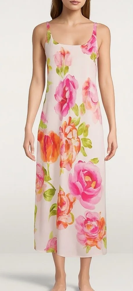 N by Natori South Pacific floral robe & slip nightgown set in pink and orange watercolor print. Lightweight charmeuse-georgette finish. Robe S, gown M. Elegant N Natori South Pacific robe and nightgown set showcasing a vibrant watercolor floral print in shades of pink, orange, and green. Both pieces feature a soft charmeuse-georgette finish—lightweight, fluid, with a luxurious drape and feel. Ivory base with pink, orange, and green floral print. Robe: Size Small — banded collar, self-tie belt. Nightgown: Size Medium — maxi length, scoop neckline, slip silhouette, relaxed drape, adjustable straps. 100% polyester. Machine wash. Excellent preowned condition. Modeled photo is AI-generated. BRAND: N by Natori SIZE: Small (robe), medium (gown) COLOR: pink, orange, green, ivory Robe (S): PIT TO PIT: 21” SLEEVE: 17” LENGTH: 48” Gown (M): PIT TO PIT: 17” WAIST: 20” HIPS: 23” LENGTH: 49” (adjustable) CONDITION: previously owned ORIGIN: Philippines Marked sizes will vary by designer • All measurements are approximate and taken flat in inches • Color may vary on your screen. •Fast Shipping •Small Business •Carefully Packaged, Smoke-Free •5-Star Seller Style & Occasion: Perfect for warm-weather lounging, bridal or honeymoon wear, resort travel, or gifting. This floral charmeuse set brings tropical elegance and effortless comfort.