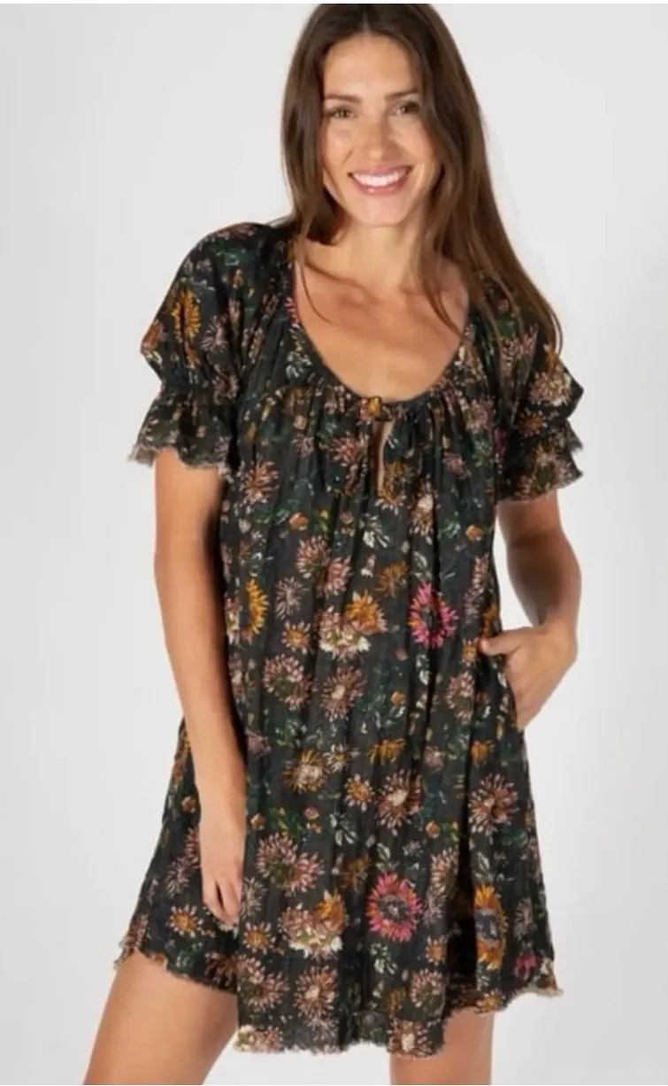 A charming black mini dress adorned with a vibrant, multi-colored floral print. This dress features... Show more