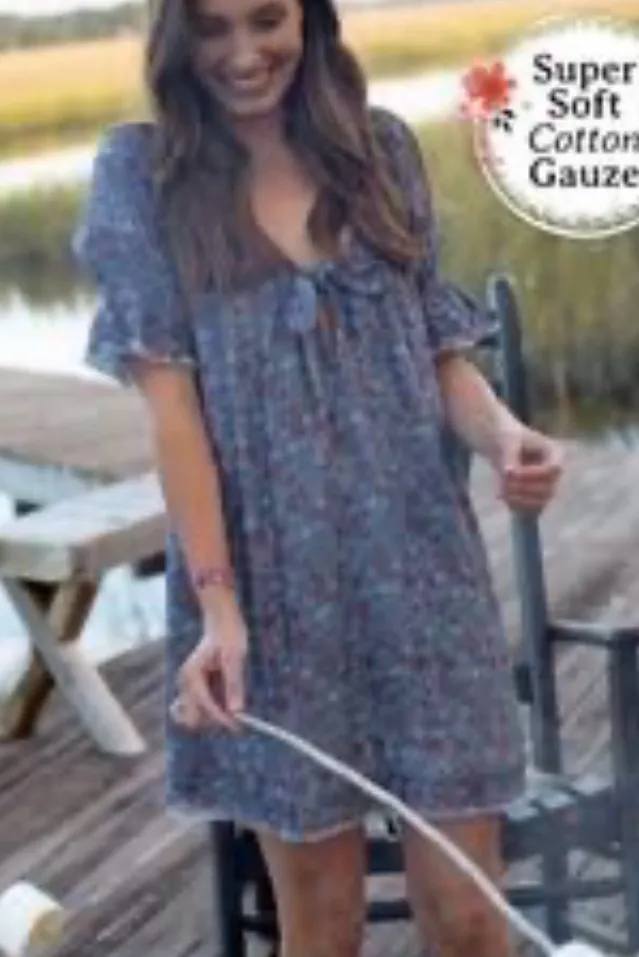 Soft cotton gauze. Frayed hem and cuffs. Short puff sleeves have smocking and frayed edges. Self tie... Show more