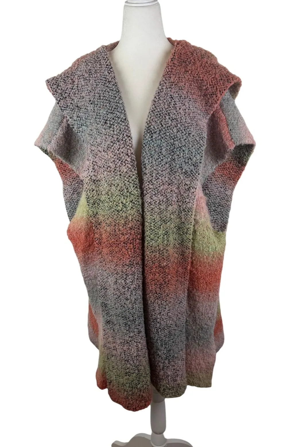 Keywords: hooded vest, open front, ombre stripes, knit cardigan, boho, casual wear, layering piece, lightweight knit, relaxed fit, cozy, streetwear, weekend style, fall fashion, Boho, Cozy, Soft Girl, Cottagecore, Fall, Warm, Sleeveless, Knit, Hippie, Hooded, Ombre, Layering, Indie, Vintage Inspired, Granola, Cabincore, Festival, Retro, Colorful, Earthy, Drape, Open Front, Textured, Natural Life, Eclectic
