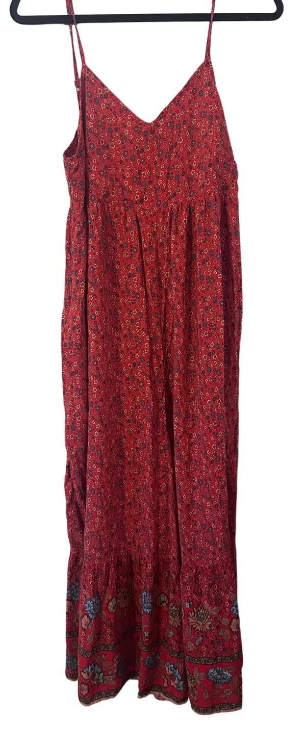 A flowing red floral print one piece pant outfit with delicate spaghetti straps and a tiered ruffle... Show more