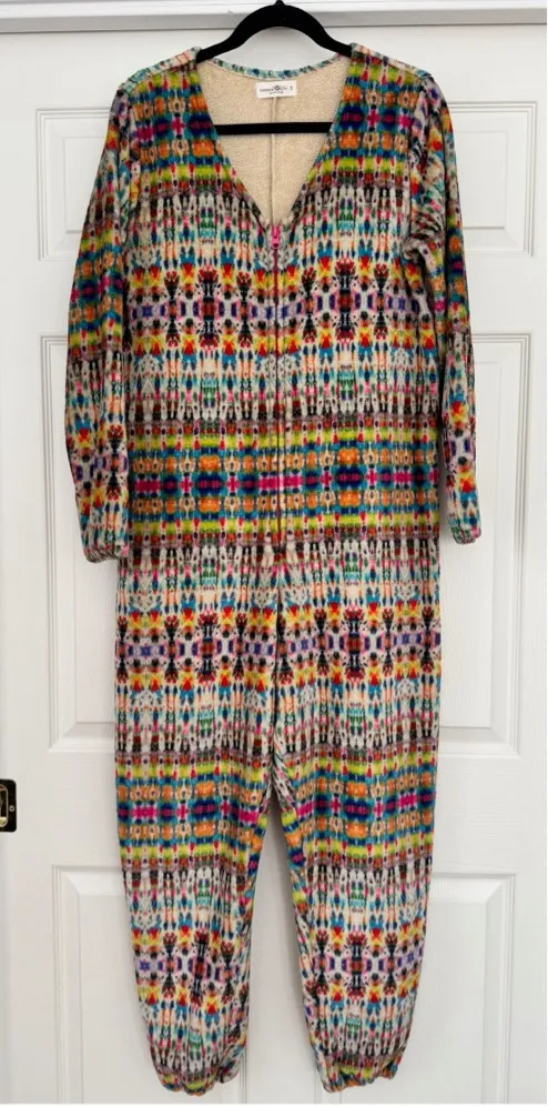 Natural Life women's pajama jumpsuit in size S, featuring a vibrant multi-color ikat tie-dye pattern... Show more